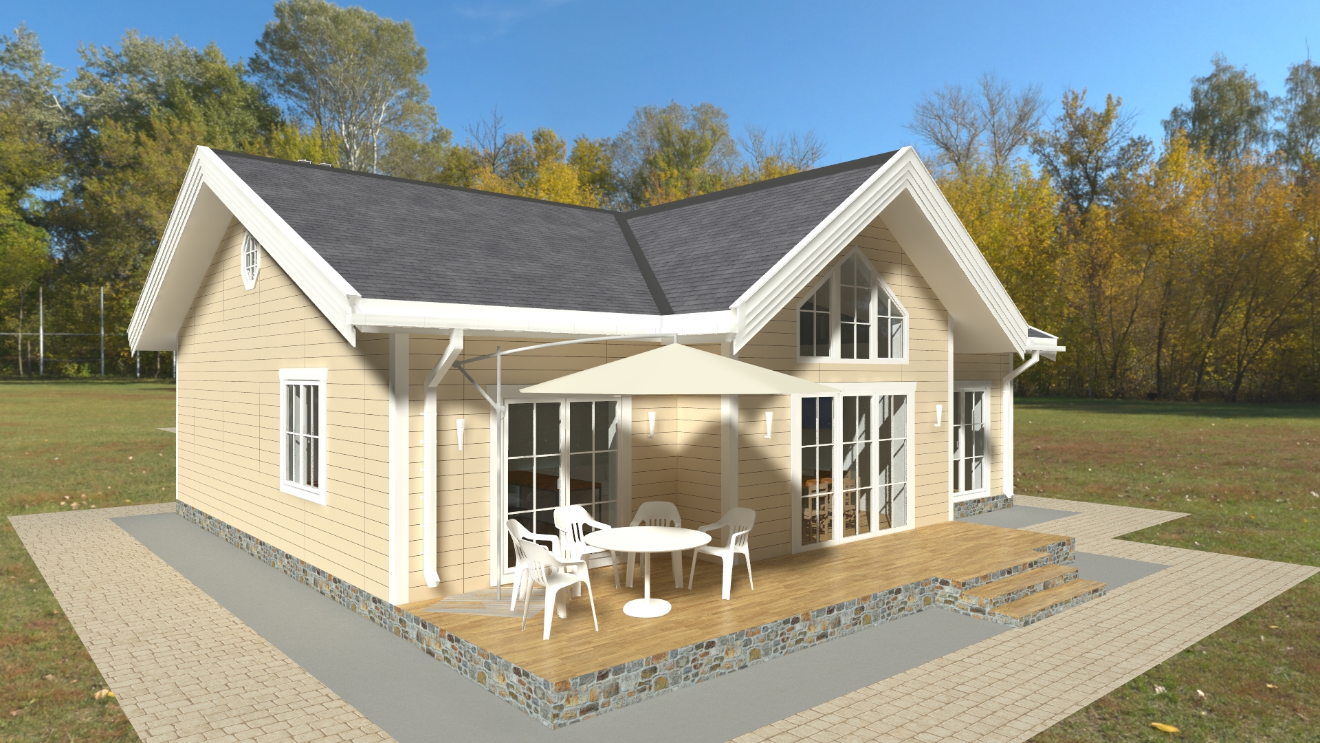 с различной отделкой фасадов, кровли, окон.