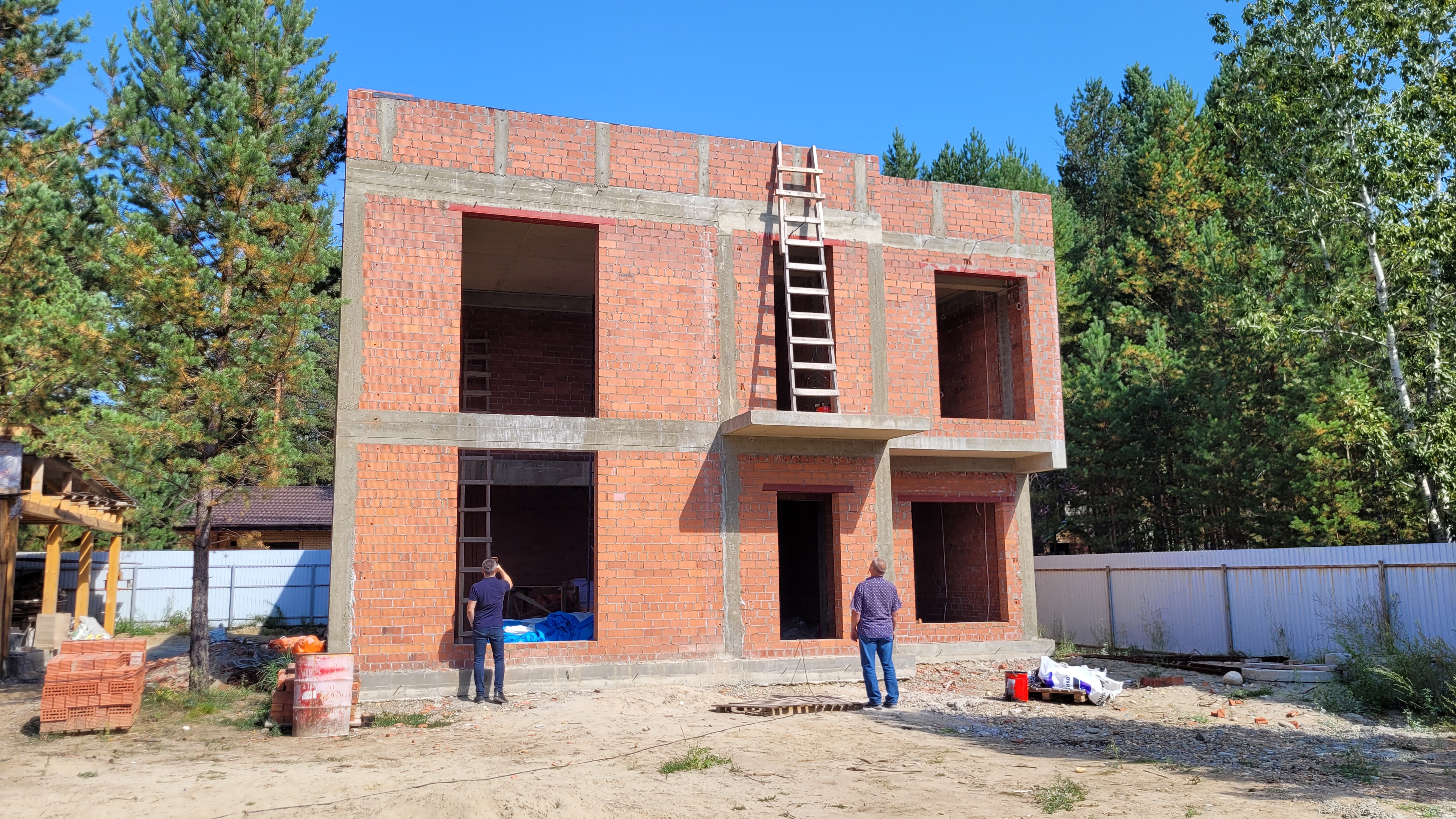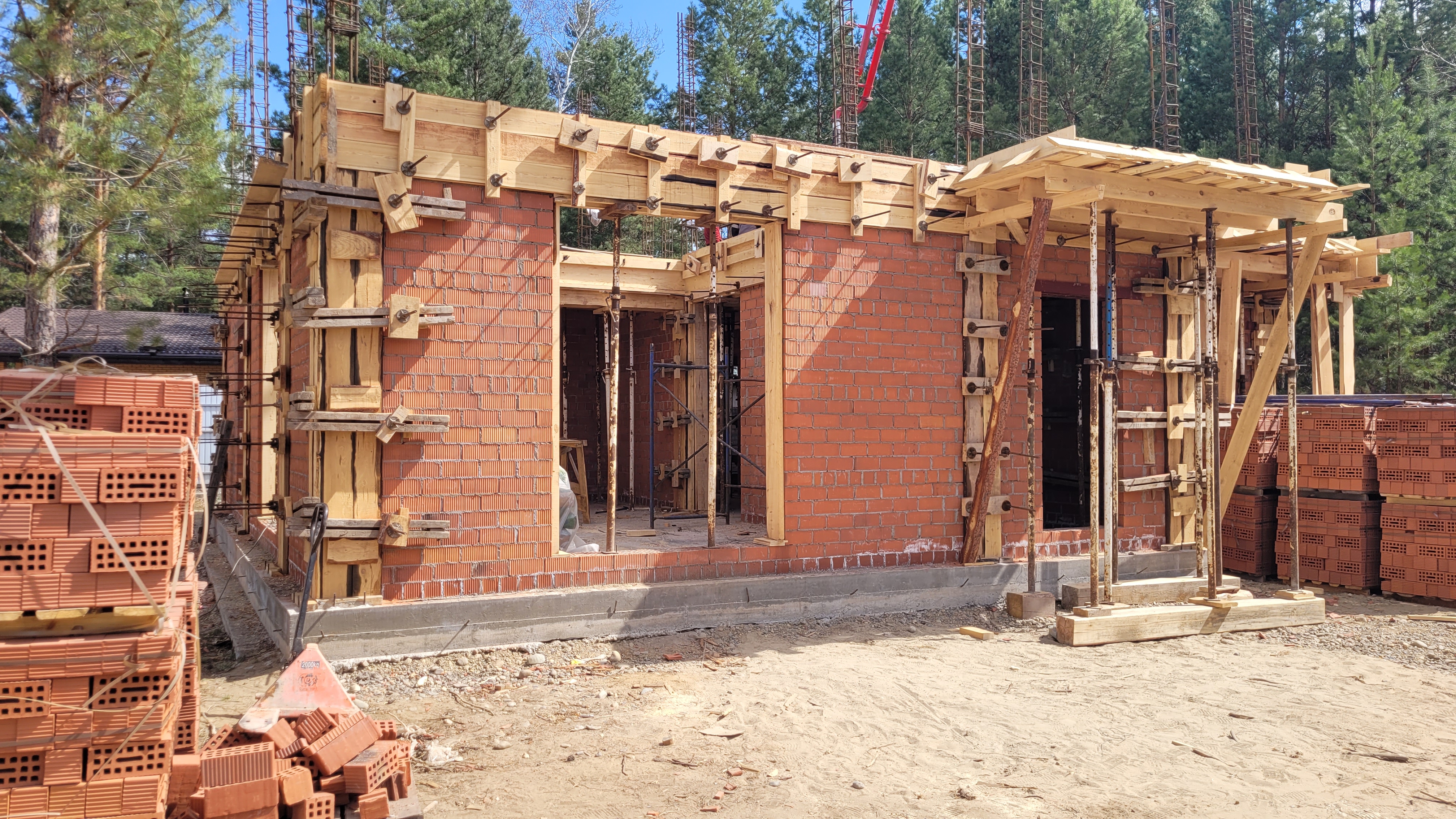 Весной 2022 года кладка стен и перегородок из кирпича. Железобетонные перекрытия и межэтажная лестница. Кровля плоская с утеплением и наплавляемой гидроизоляцией. Перейти на страницу проекта Белград 250.
