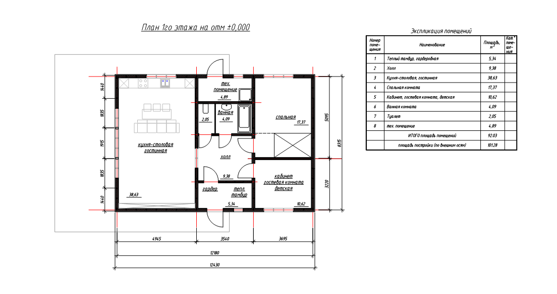 - Габаритные размеры дома: 12,4 х 8,3 м.