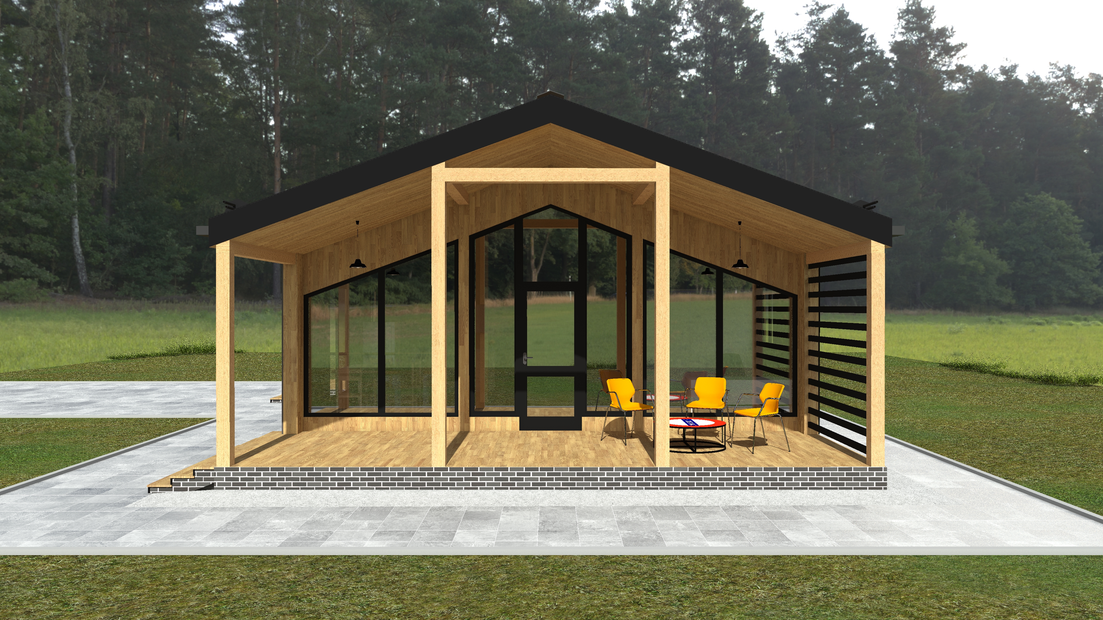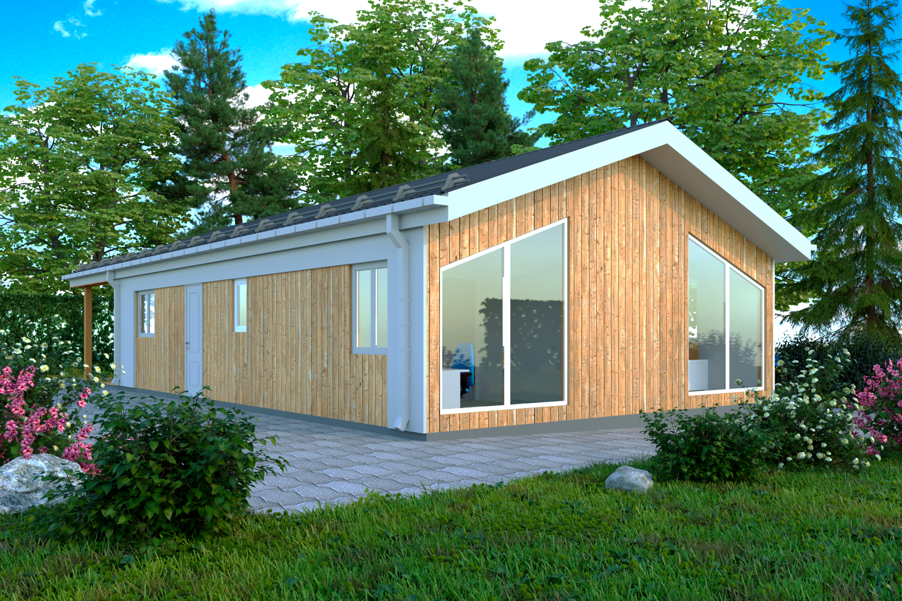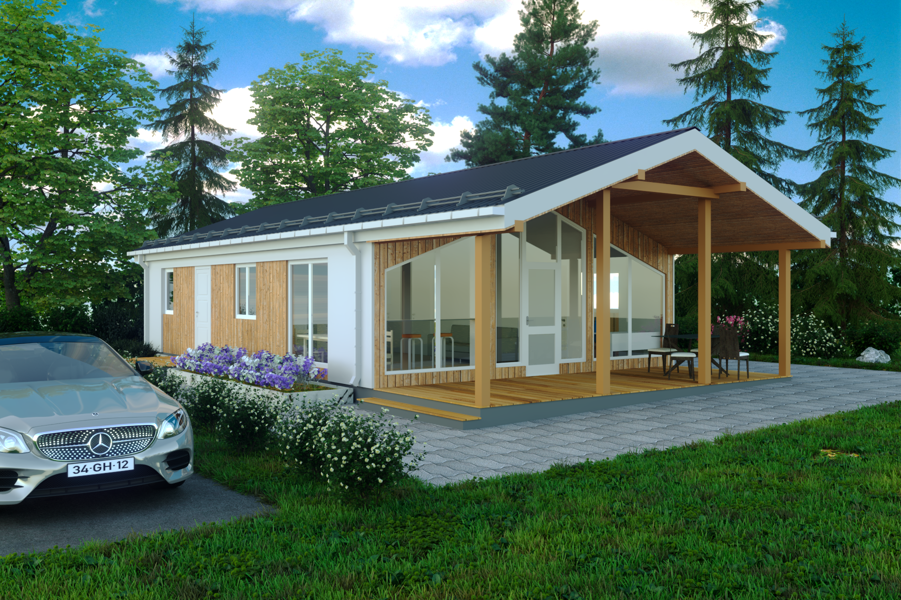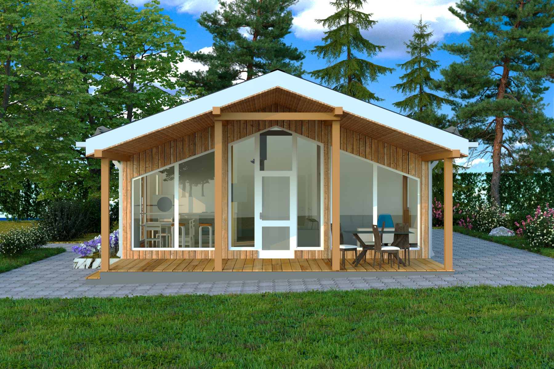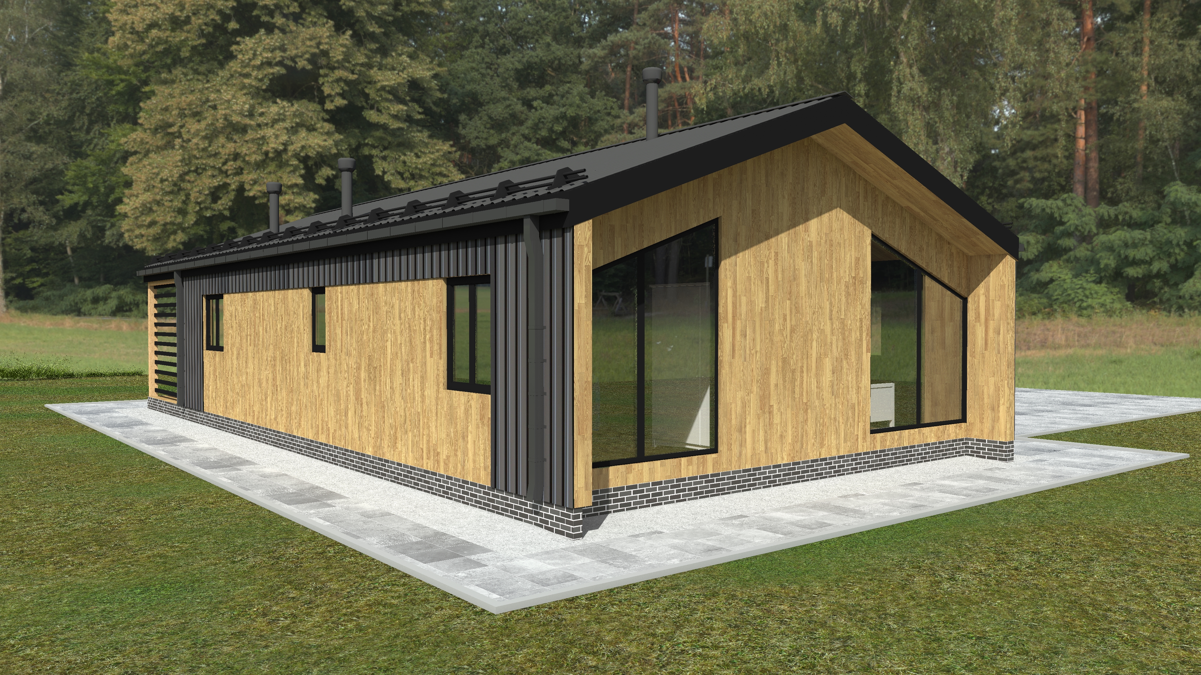 Одноэтажный дом в стиле барнхаус, выполненный по каркасной технологии. В доме две спальные комнаты, кабинет, два санузла, сауна , большая крытая терраса и гостиная, совмещённая с кухней создают одно большое пространство.