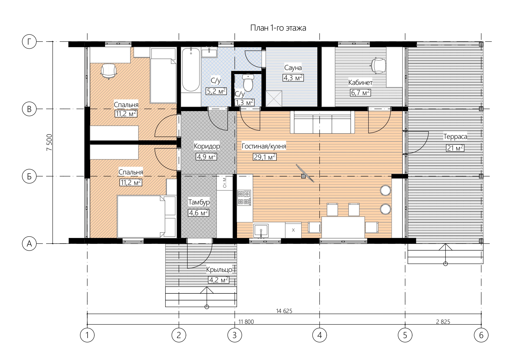 - Габаритные размеры дома: 7,5 х 14,8 м.