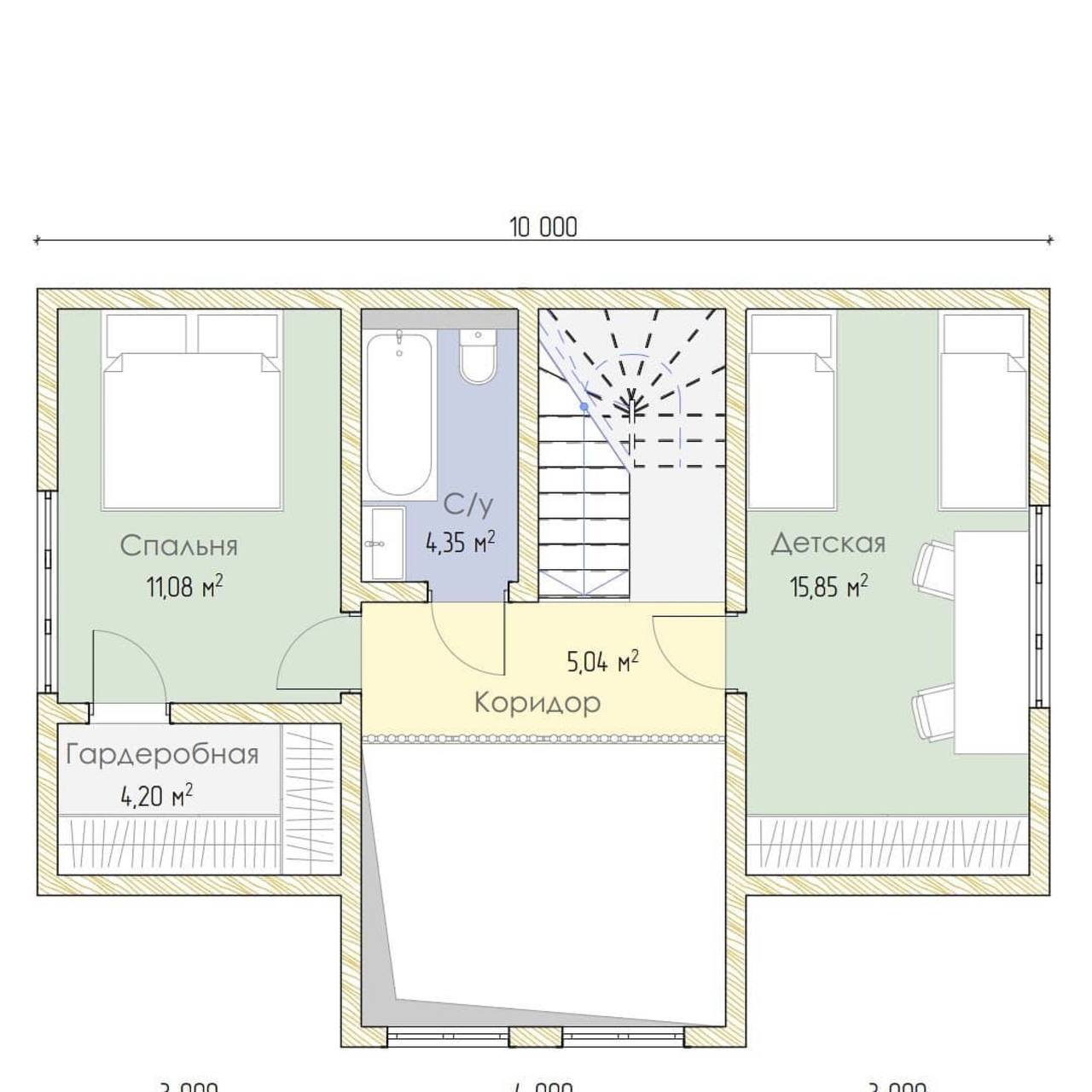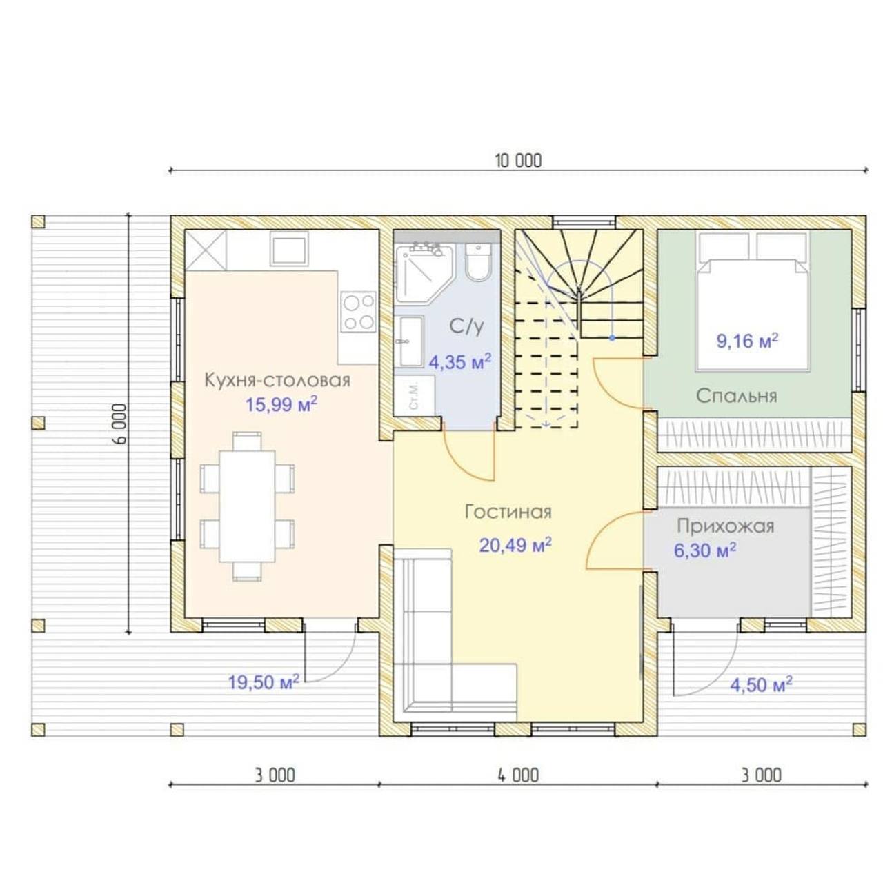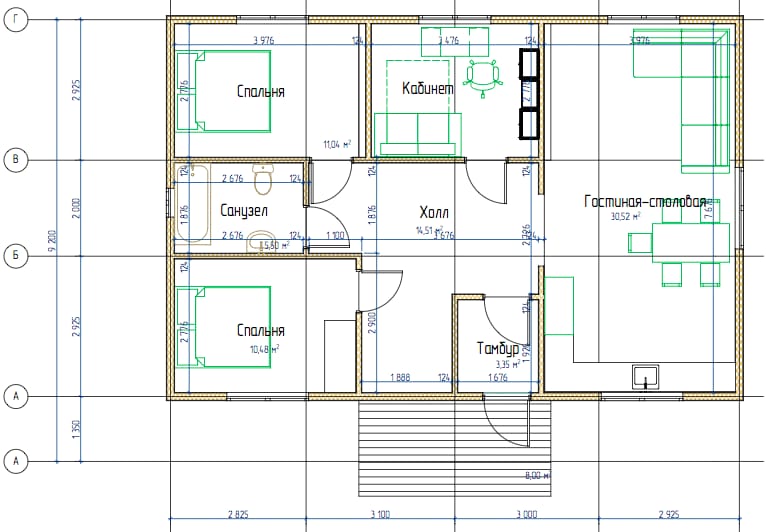 На этаже: холл, кухня, гостиная, спальня, санузел, бойлерная.