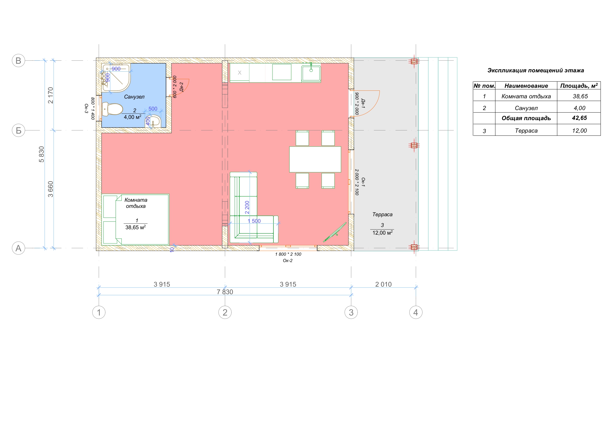 - Общая площадь помещений: 42 кв.м.