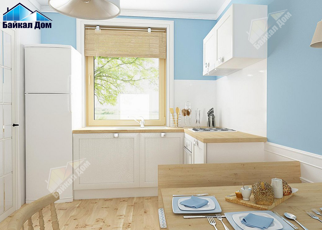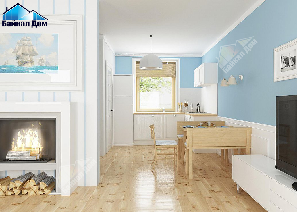 - открытая кухня зрительно увеличивает пространство дневной зоны, в то же время она деликатно отделена от гостиной камином; при необходимости ее можно сделать полностью закрытой;