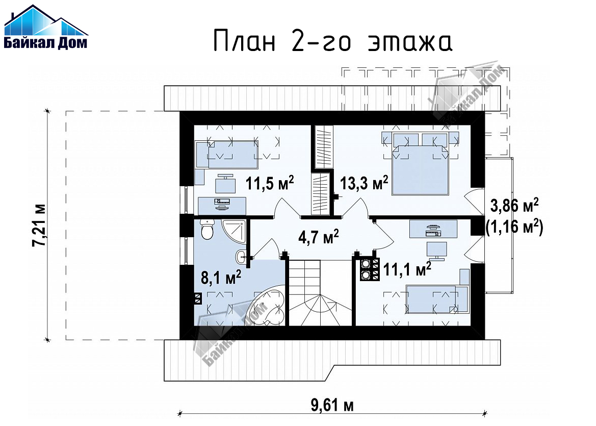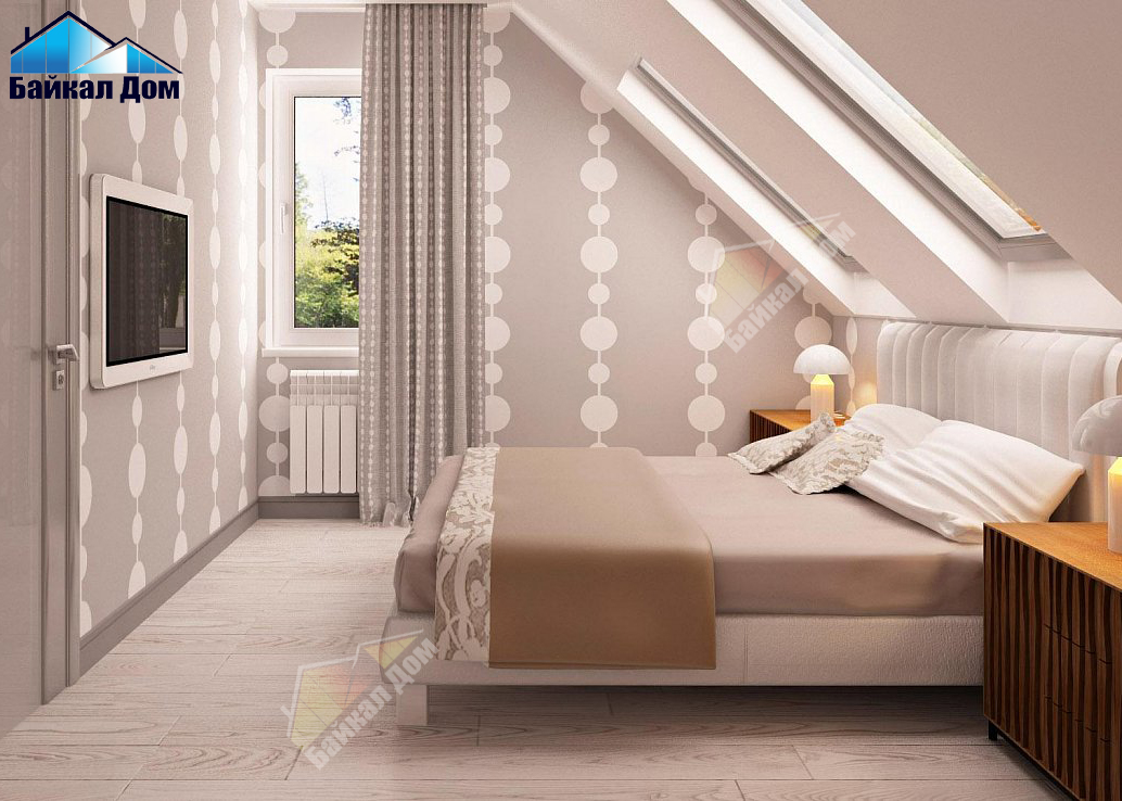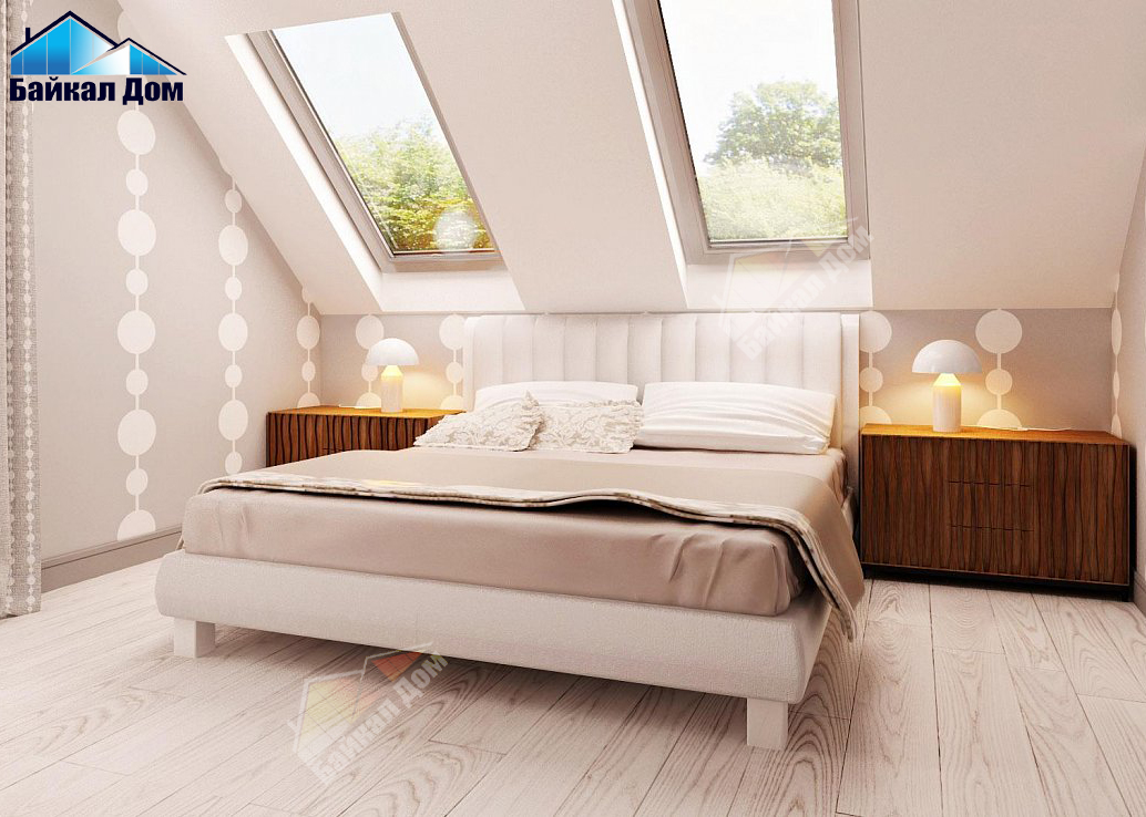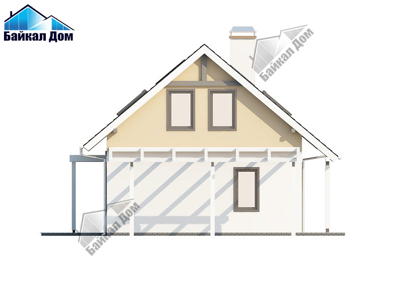 При необходимости от нее можно отказаться для увеличения площади кухни. Две спальни на мансарде имеют выход на балкон. Размещение санузлов один под другим способствует более быстрой и простой установке водопроводной системы. Традиционный характер дома высоко оценят любители классики в архитектуре.