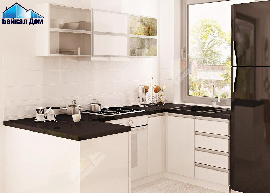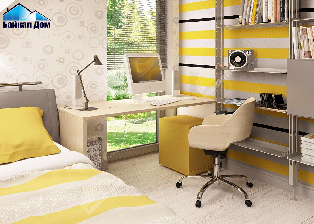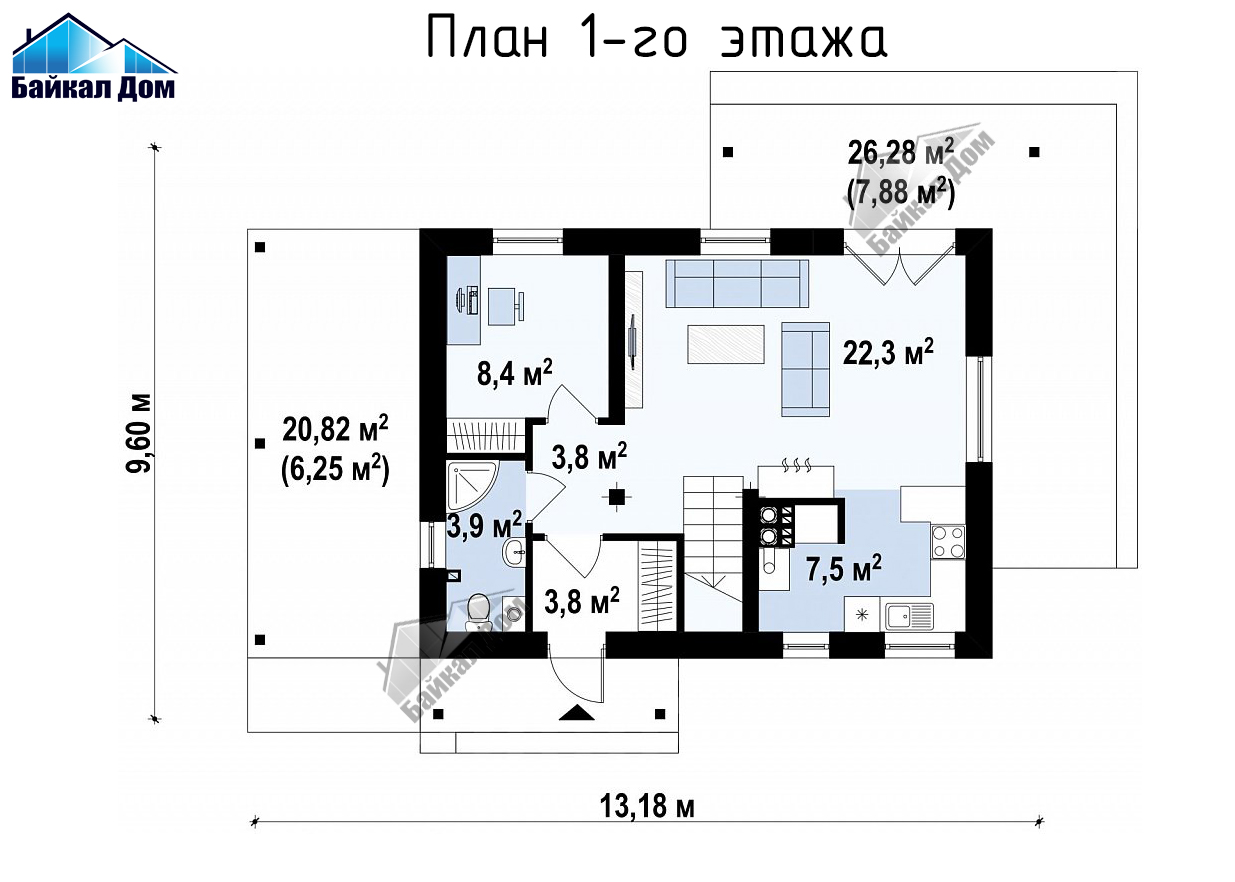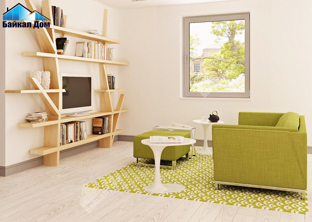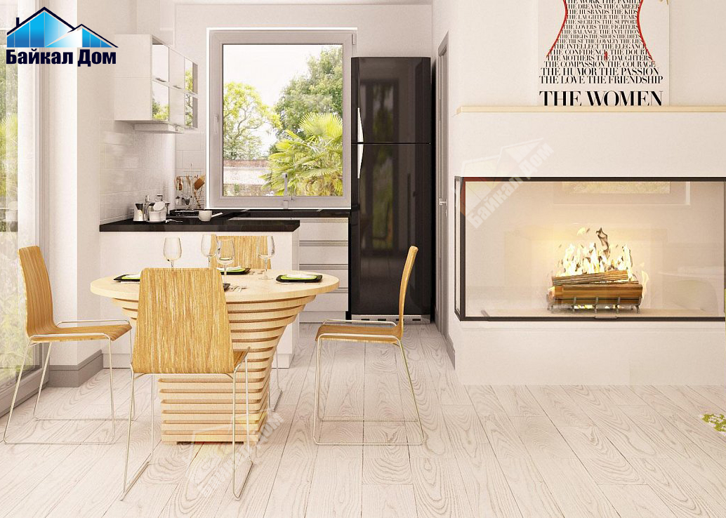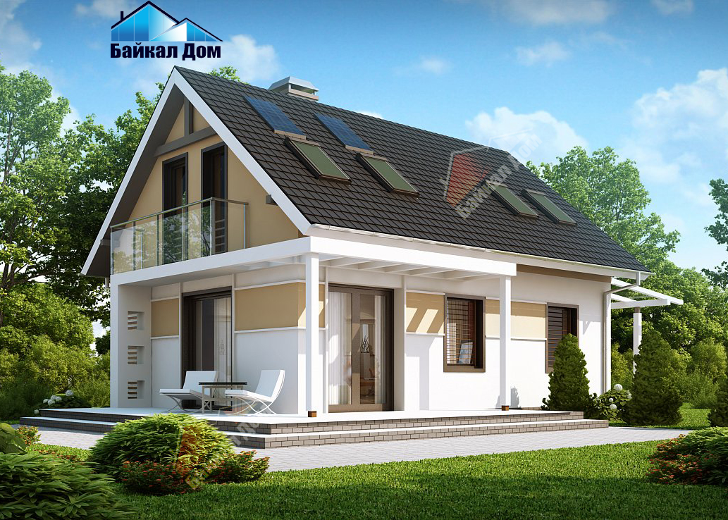 Простая конструкция дома и двускатная кровля, его относительно небольшая площадь помогут вести строительные работы быстрее и проще, а также сократить строительные и эксплуатационные затраты. Открытая кухня сделает гостиную визуально больше и светлее. Хотя при необходимости ее можно отделить стенной перегородкой. Частично крытая терраса сможет стать уютным местом летнего отдыха рядом с домом.