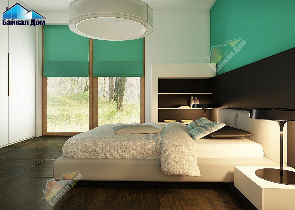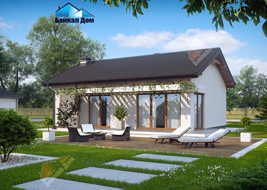 Небольшая площадь дома и простая двухскатная кровля делают этот дом бюджетным для строительства и эксплуатации;