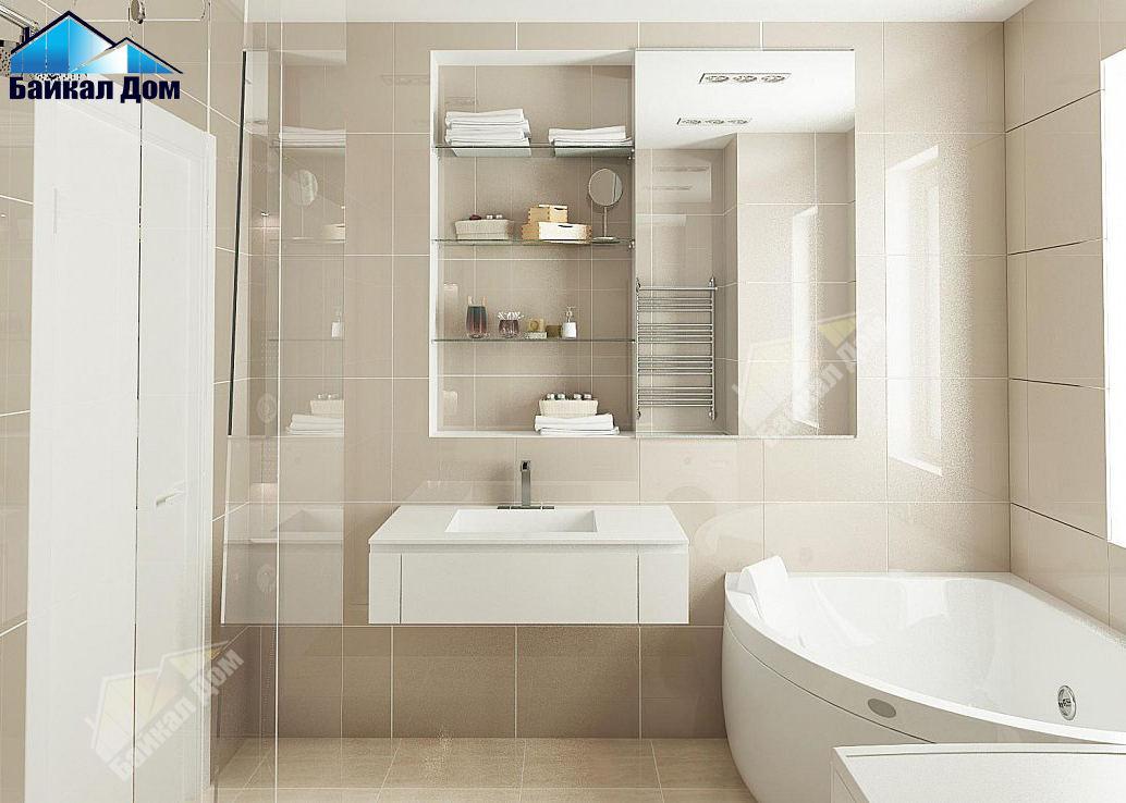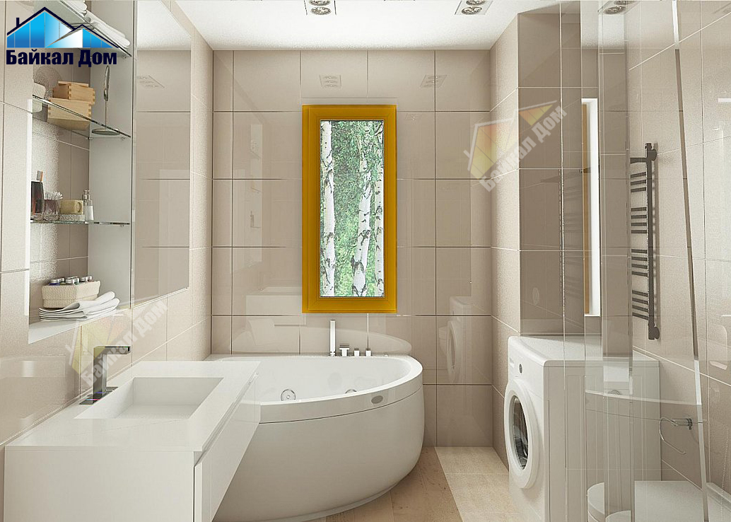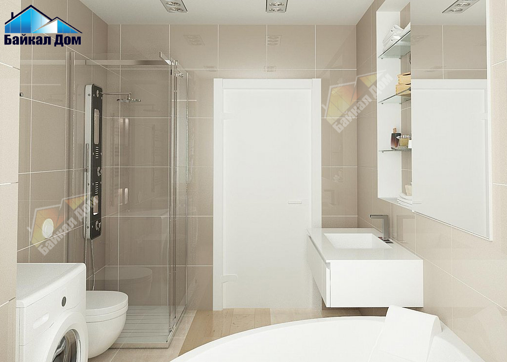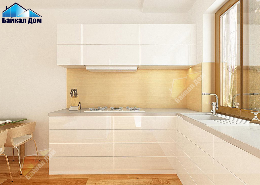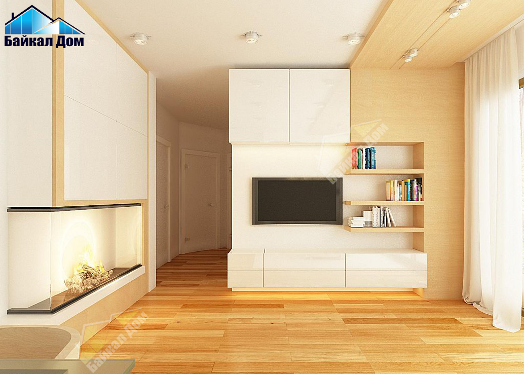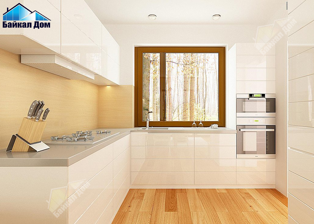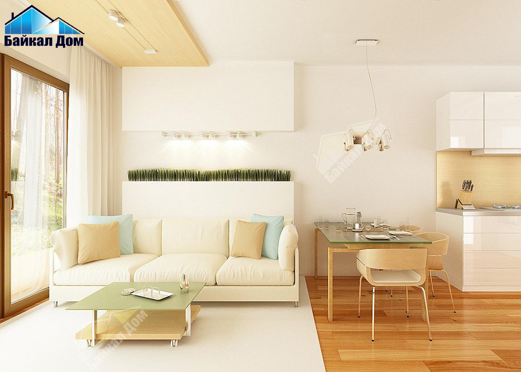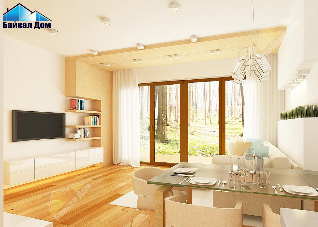 В центральной части дома расположен холл, который связывает все помещения. Гостиная с выходом на террасу и хорошим естественным освещением объединена со столовой и кухней, кроме того, к ней примыкает хозяйственное помещение, что делает зону отдыха не только удобной, но и эргономичной. В другой части находится ночная зона с двумя спальнями и большой ванной комнатой.