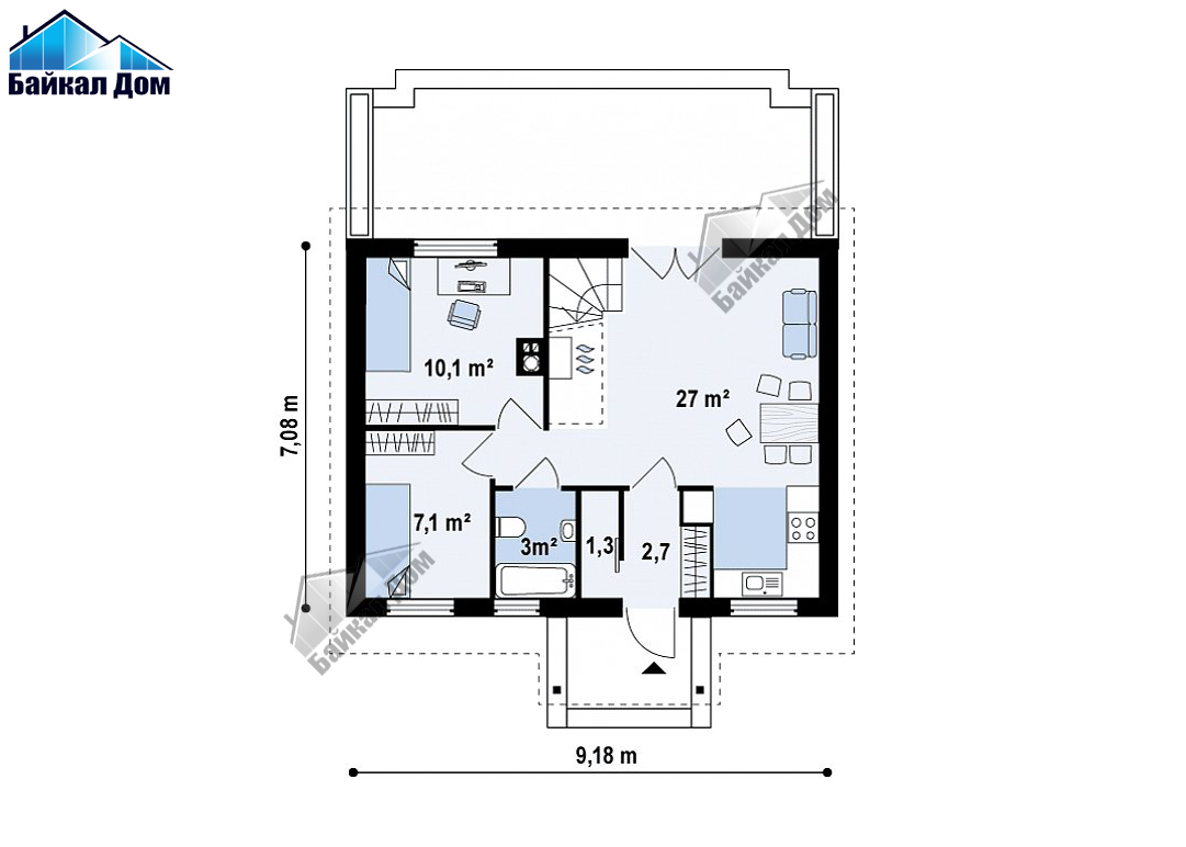 Проект Z32 — это компактный традиционный дом простой формы с двускатной крышей. Скромный и аккуратный экстерьер скрывает удобную, функциональную планировку интерьера. Благодаря своим компактным габаритам и отсутствию окон в боковых стенах дом можно разместить небольшом участке 15х15 м.
