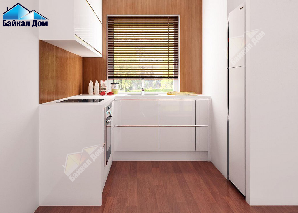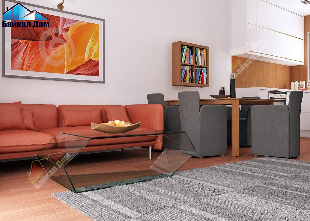 - Открытая кухня визуально увеличивает пространство дневной зоны.