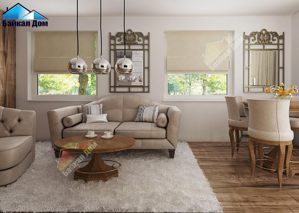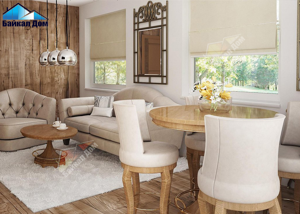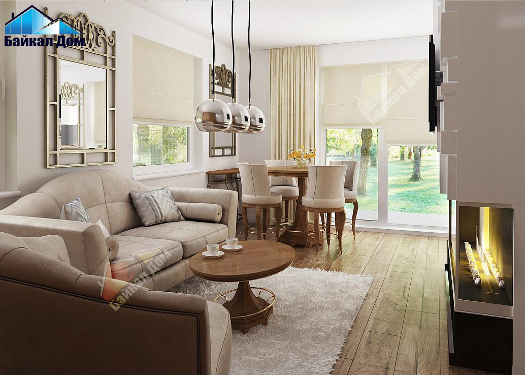 Открытая кухня зрительно увеличивает пространство дневной зоны. Расположенный в центре камин сможет не только украсить собой интерьер, но и стать дополнительным источником тепла в холодное время года. Расположение окон в дневной зоне с трех сторон (северной, западной, южной) способствует ее хорошему естественному освещению.