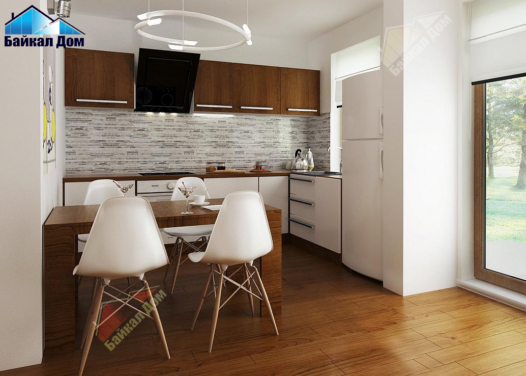 - Открытая кухня зрительно увеличивает пространство дневной зоны. При желании ее можно сделать полностью или частично закрытой.