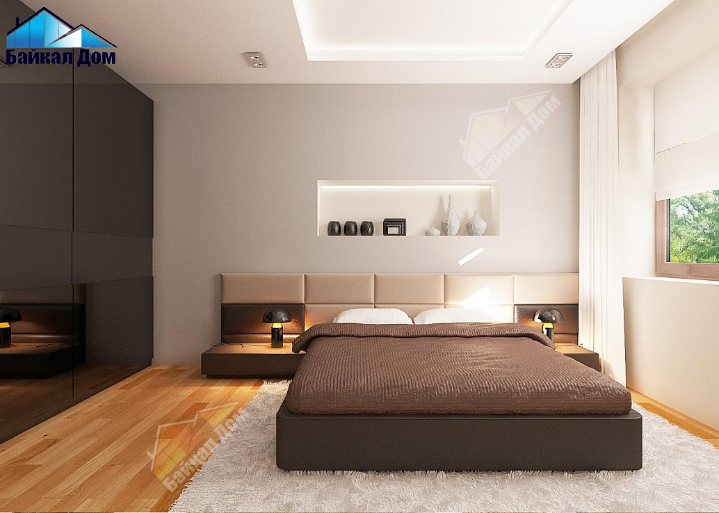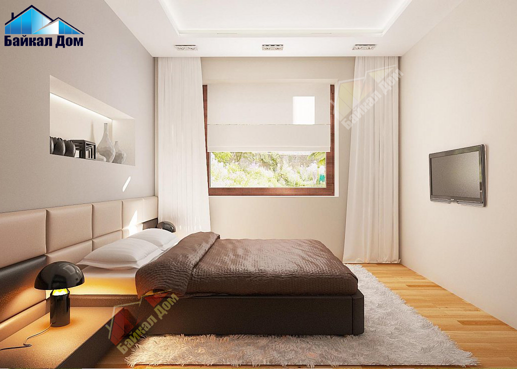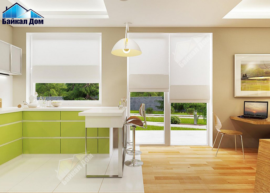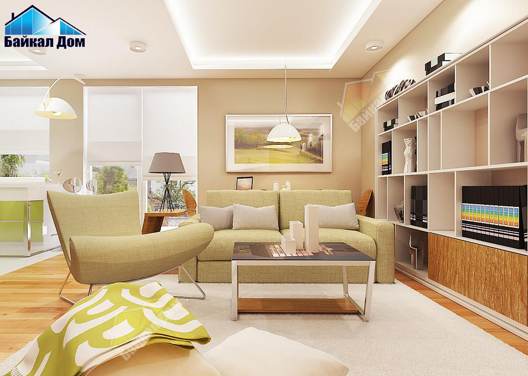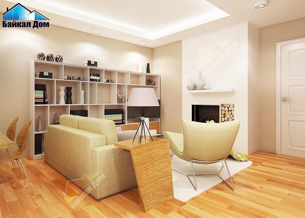 Отсутствие несущих стен дает возможность вносить самые различные изменения в планировку. Для увеличения гостиной кухню можно обустроить на месте одной из комнат. Или наоборот можно увеличить одну из спален за счет дневной зоны. Открытая планировка кухня зрительно увеличивает пространство гостиной. Камин, расположенный рядом с котельной поможет сократить расходы на отопление в холодное время года, и конечно же наполнит гостиную уютом домашнего очага.